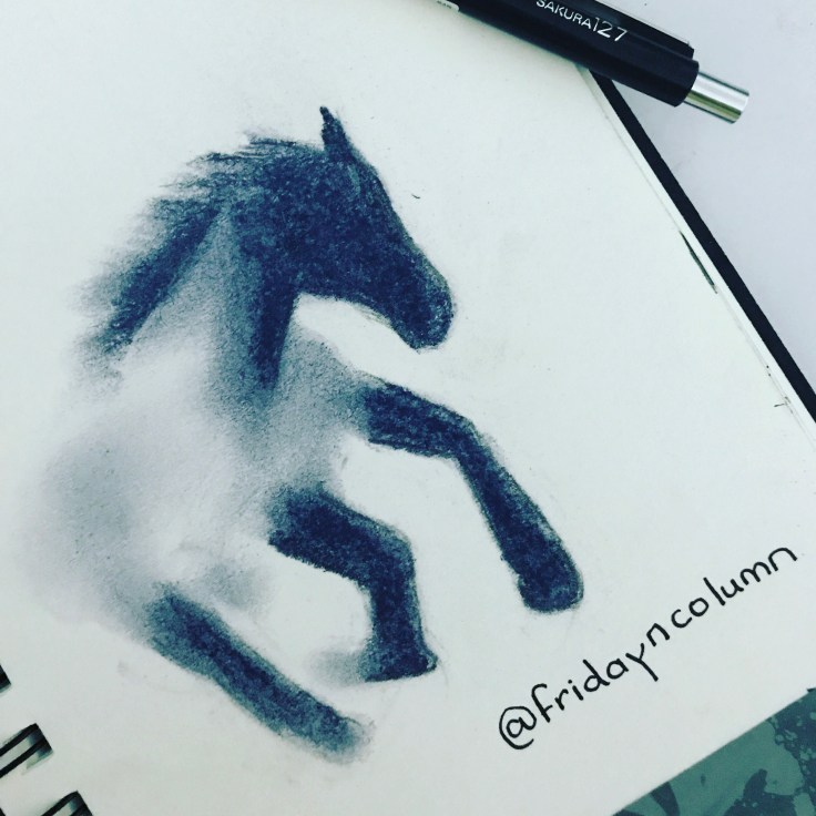 I wanted to brush up my charcoal skills before taking up a complicated artwork, so did this equine art in grey charcoal in five minutes flat.