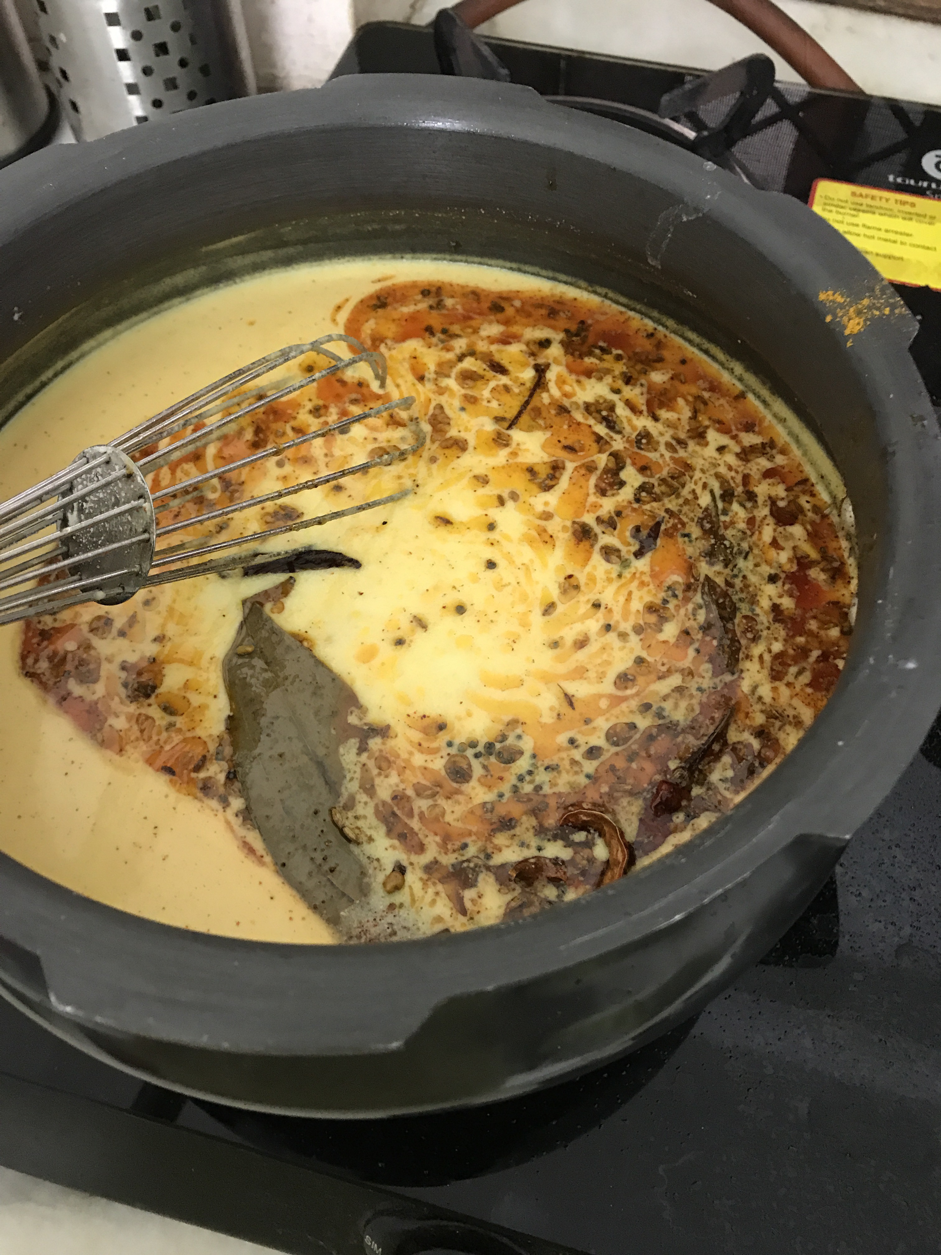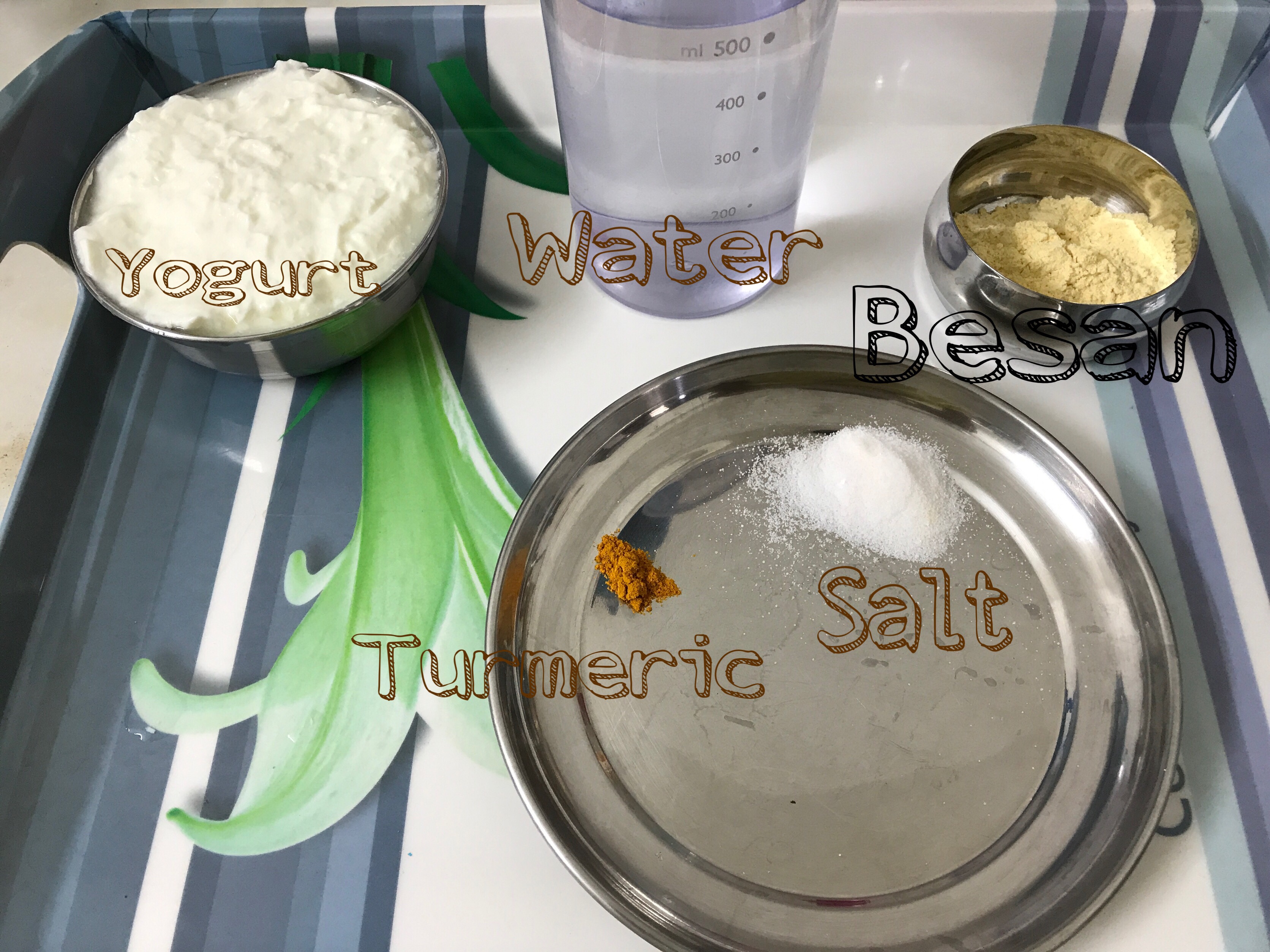 - Mix the ingredients for kadhi in a deep dish pan and whisk well with a wire whisk.