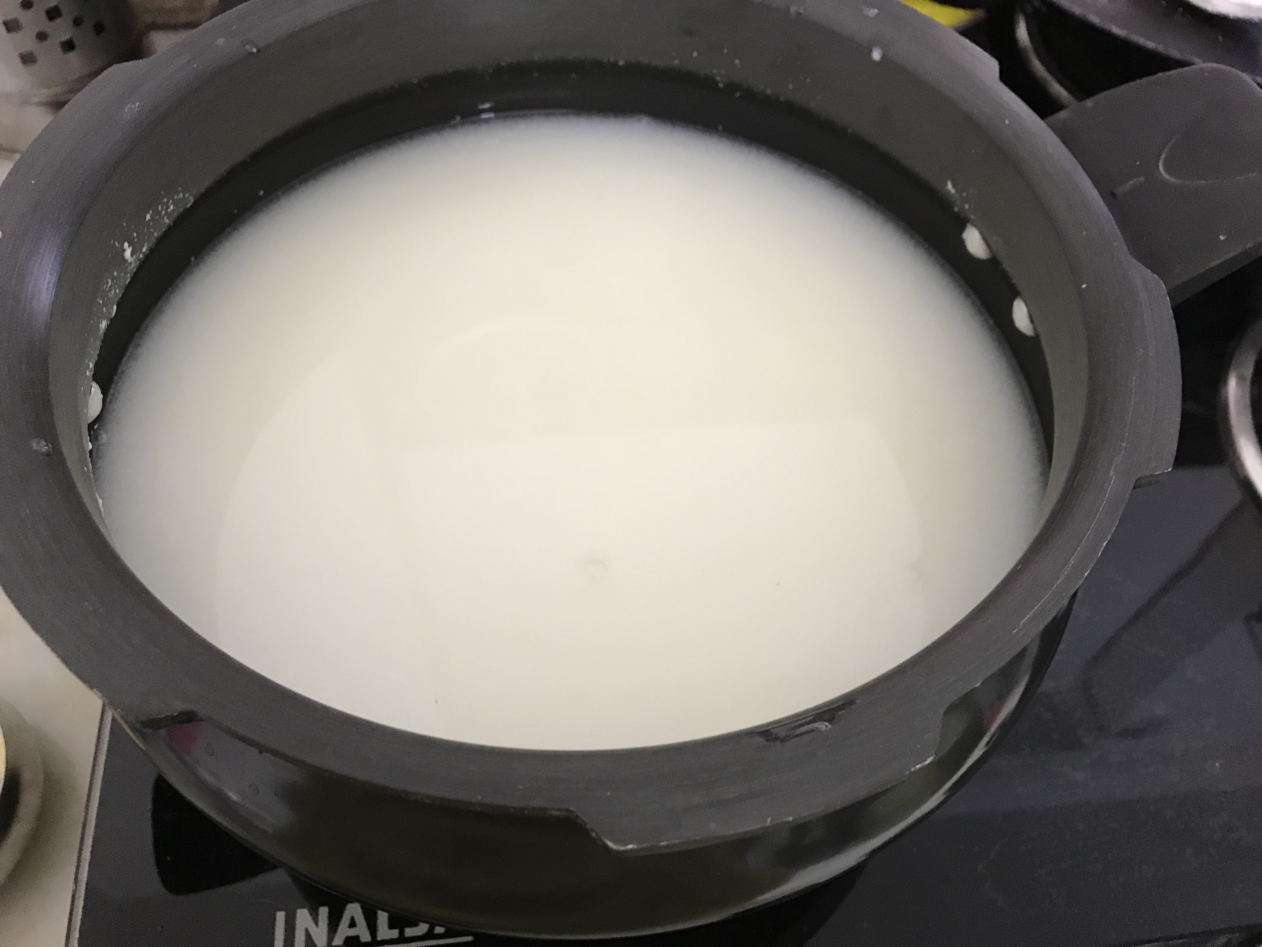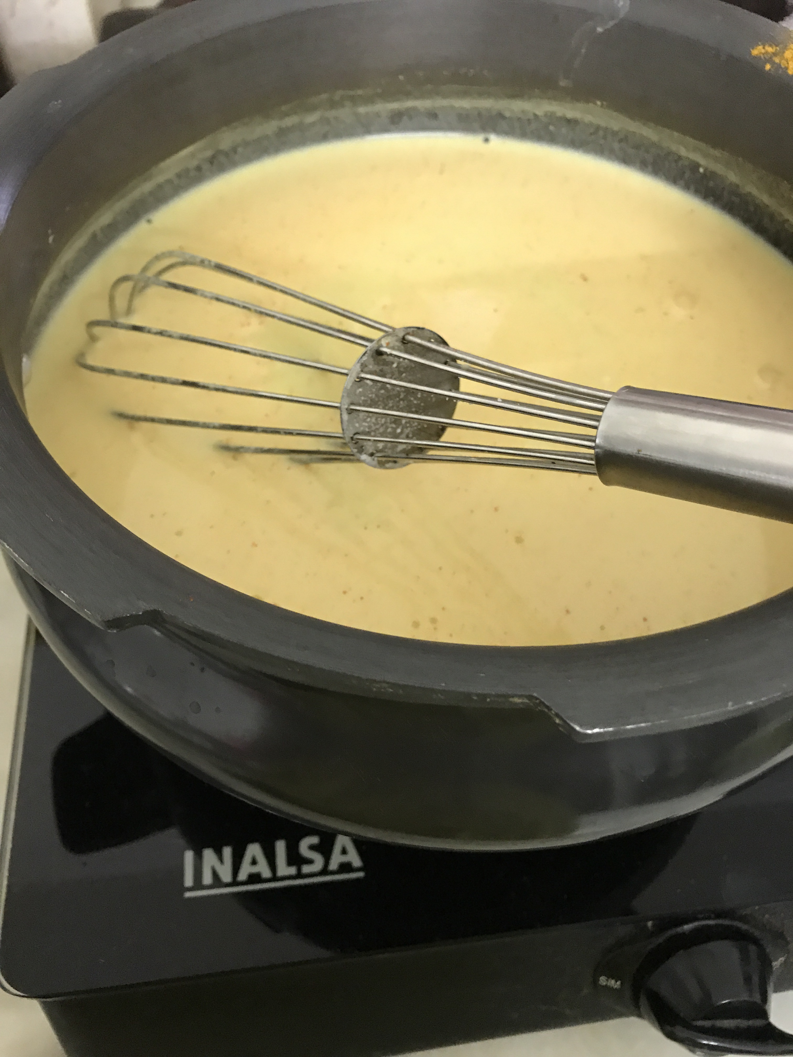 - Bring it boil and then cook on low heat while continuously stirring with a wire whisk. Cook for 7-10 minutes till besan gets cooked. The consistency should neither be thick nor runny.