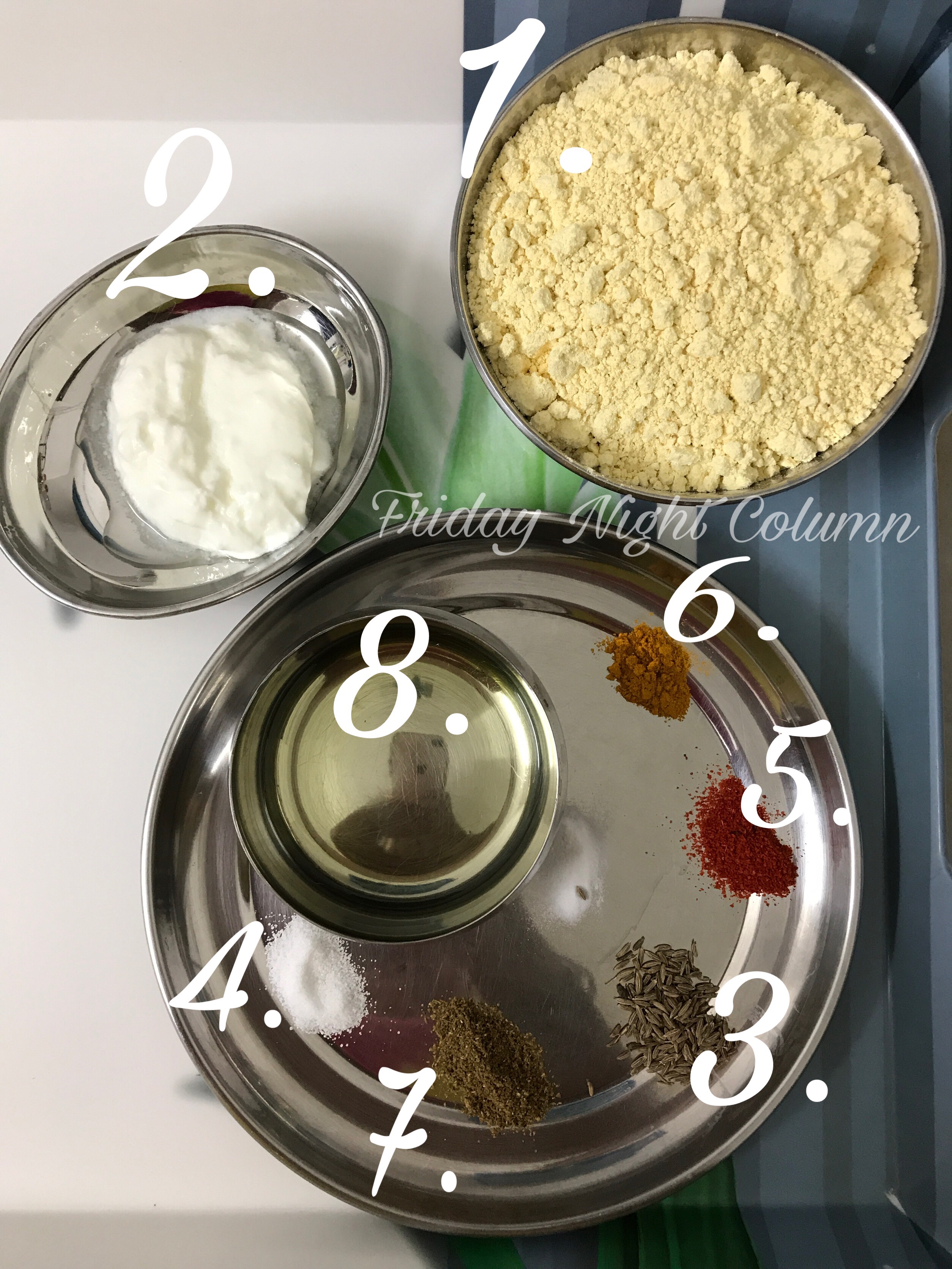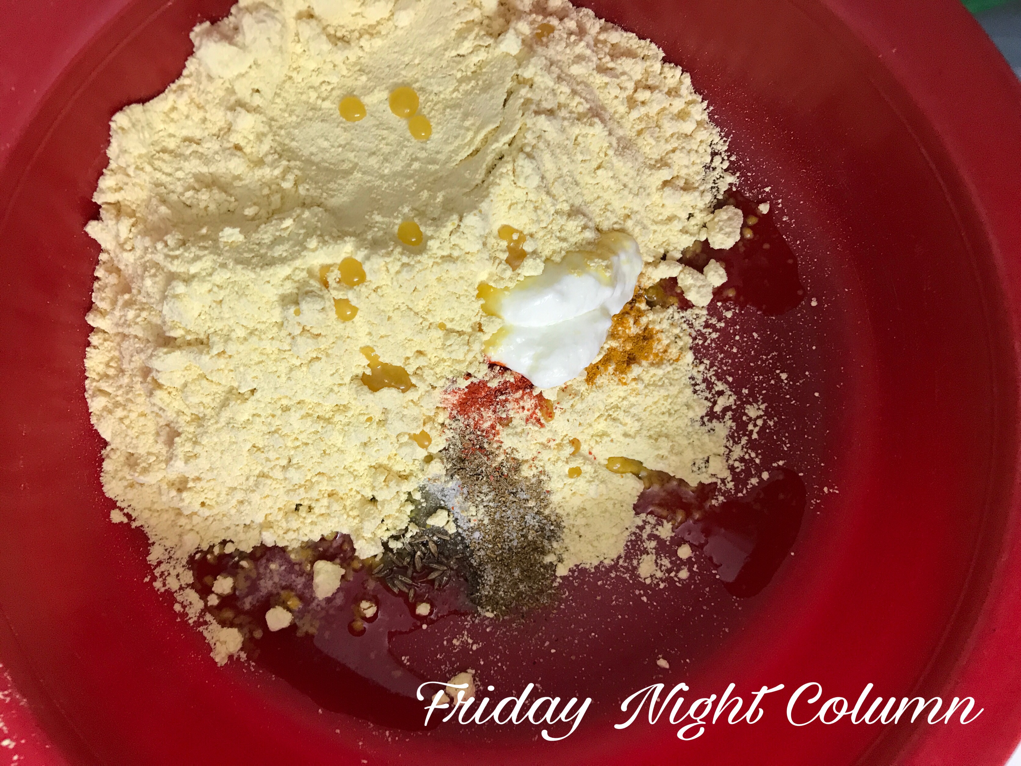 1. Take Besan, curd , oil and other ingredients mentioned in ‘for the Gatta discs’ category and make a hard dough using minimal water