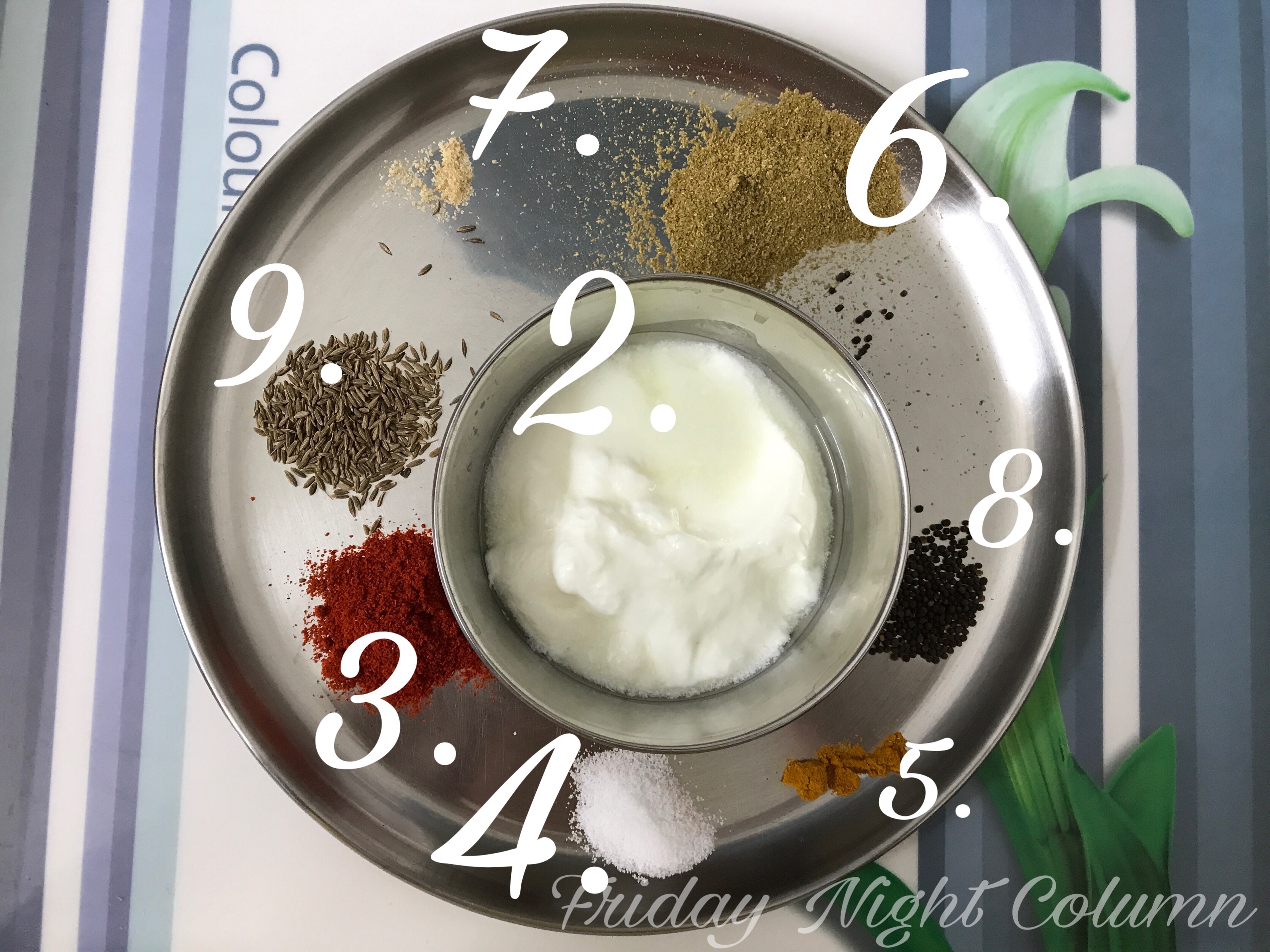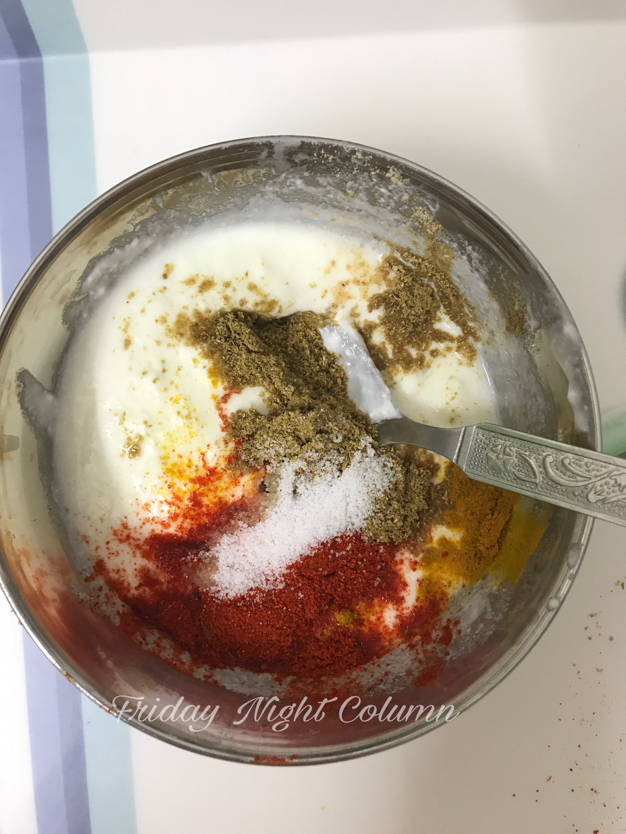 2. Take curd in another container and add the salt , turmeric , red chilli powder, coriander powder and heeng to it . Mix well.