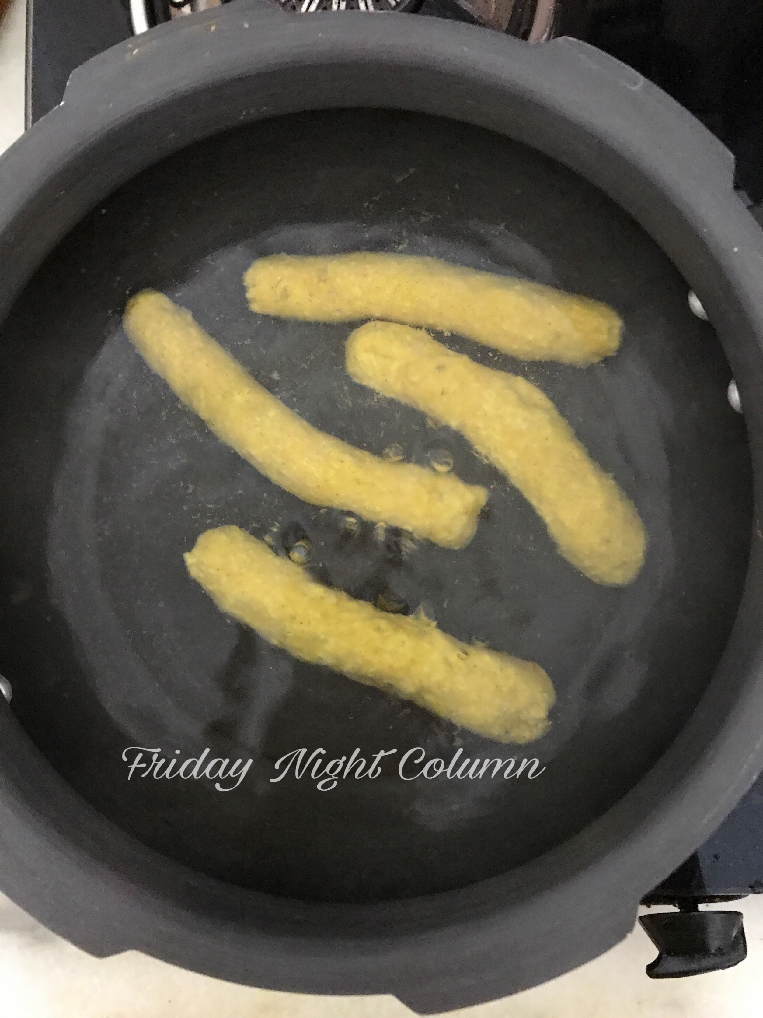 2. Shape the dough in thick cylinders . Use oil and dry besan to give them shape.