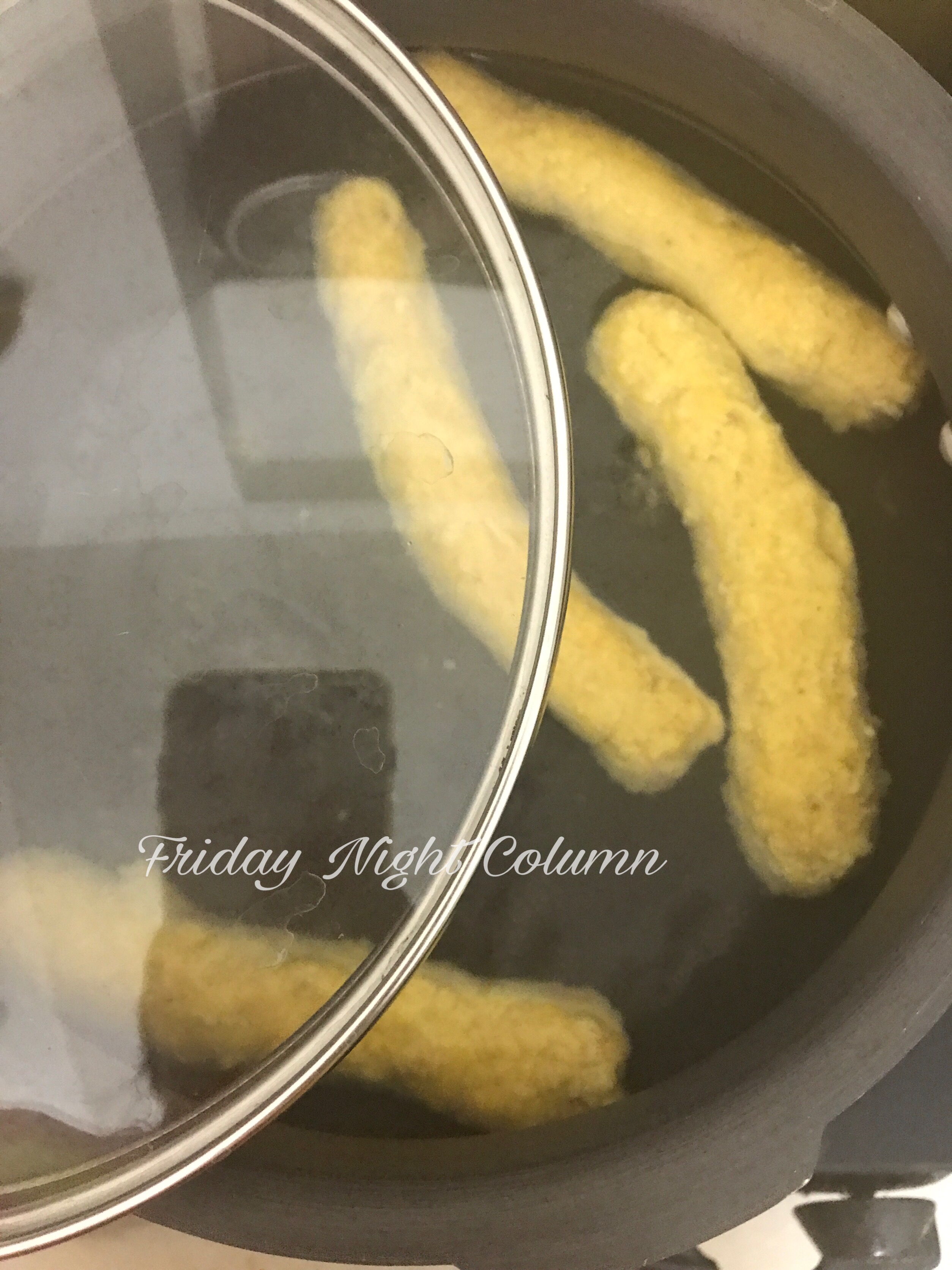 4. Once the water starts boiling , add the Gatta cylinders and cook for 8-10 minutes till the Gatta starts floating in water .