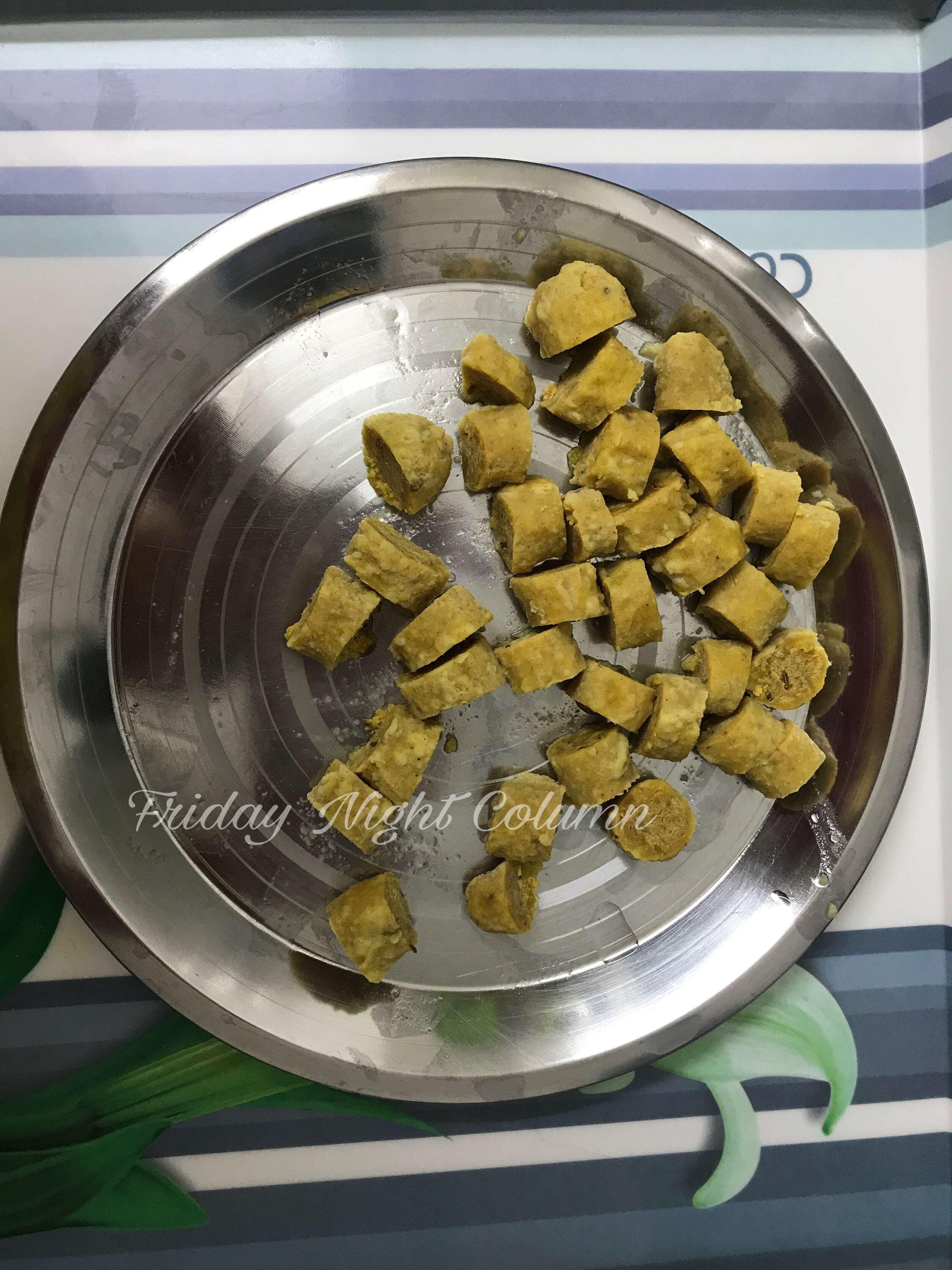 5. Strain the water and keep it for making gravy . Cut the Gatta cylinders into 1/2 inch thick discs.