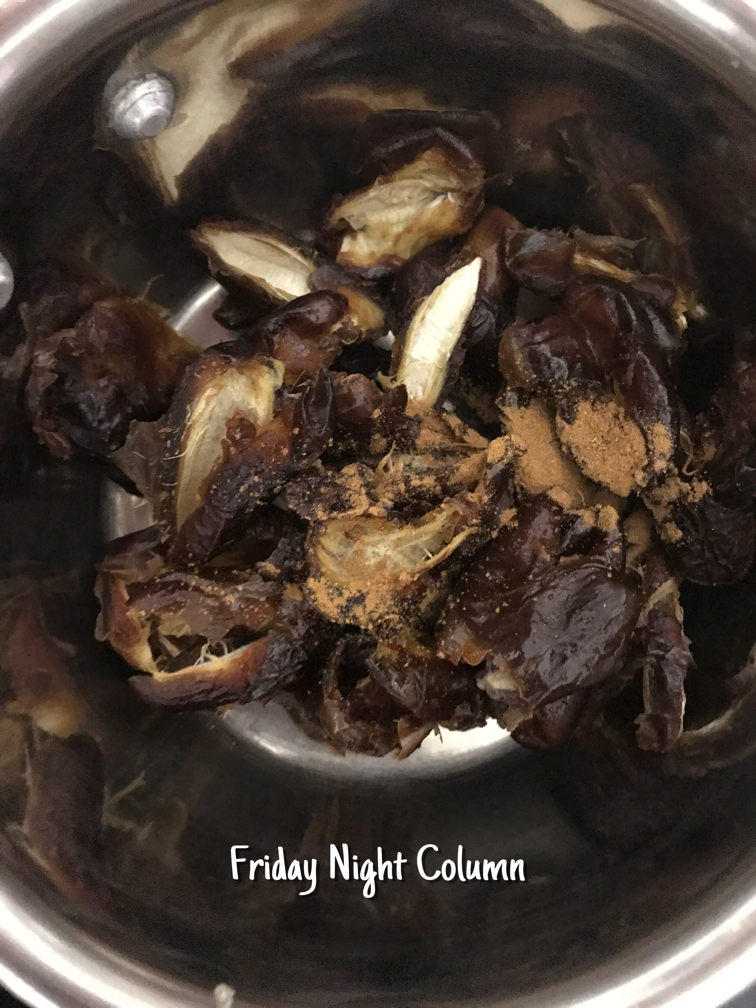 - For Dates Purée: Take a saucepan and add dates (pitted/ stones removed) , cinnamon powder and water (enough to cover them) and cook on low heat .