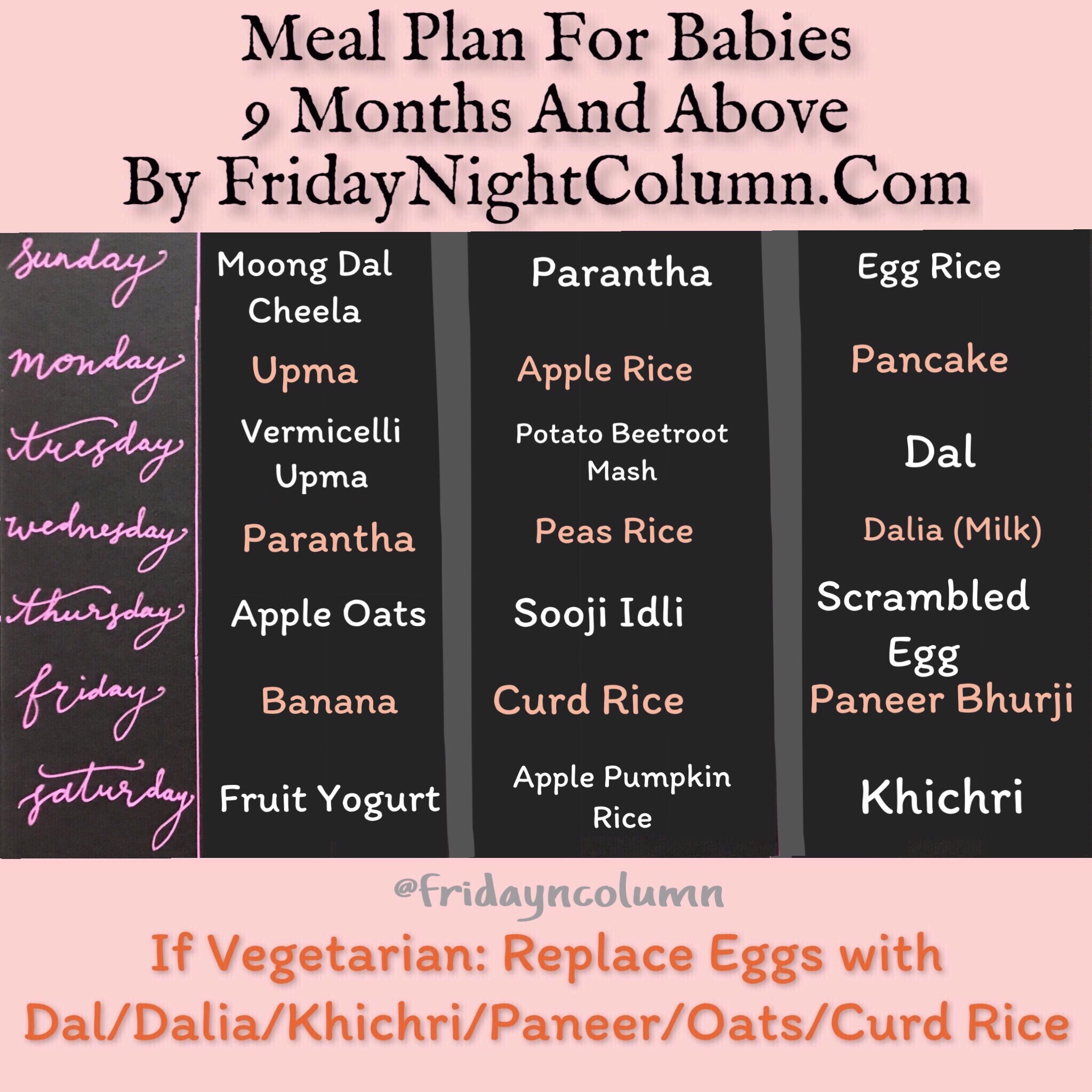 For more meal plans and baby food recipes Sign Up/ follow Friday Night Column on Facebook , Click Here!