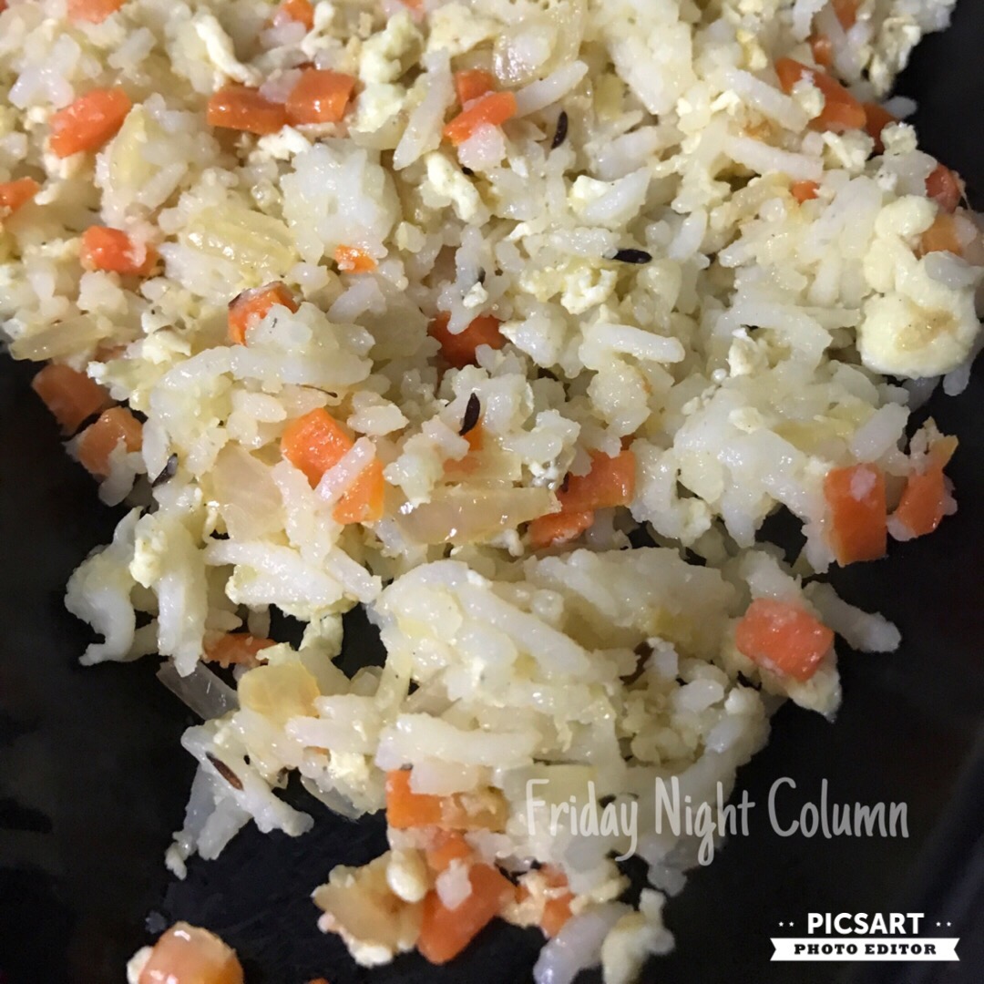 - Egg Fried Rice : Take oil (1tbsp) in a Kadhai/wok. Heat and add garlic (1/2 tbsp) followed by onion (1 tbsp) and carrots (1tbsp) , badi elaichi (one), grated nutmeg (a pinch) . Cook till onions become translucent and carrots become soft.Whisk one egg in a bowl . Add the egg to the Kadhai on low heat and cook till slightly done. Add 1 cup cooked rice . Cook for 2 minutes .Remove black cardamom (badi elaichi) from pot.Add salt (optional) .Serve warm.