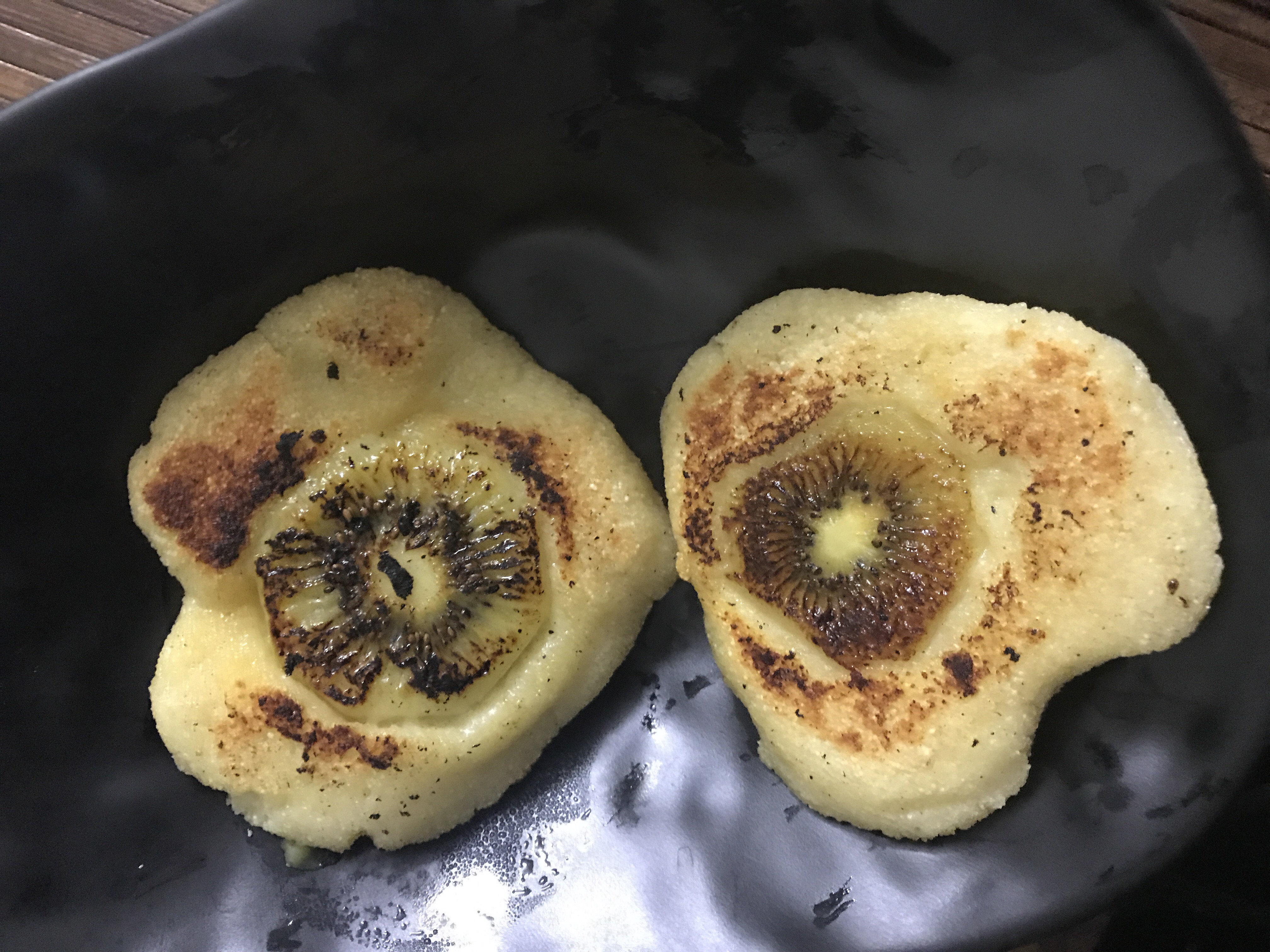 - Suji Pancakes : Take suji 1/2 cup and curd 1/2 cup in a bowl,add salt and fruit salt(eno),mix well to from a dough.Add a few tsp of water if needed. Keep this dough aside for 5 min, and let it ferment. Heat oil in a pan and grease the pan with it.Make a flat pancake of the dough by pressing a ball of the dough between your palms . Put the pancake on the greased pan and cook for 2-3 minutes or until golden . Turn the sides of the pancake till both sides turn golden . Soak excess oil on a kitchen towel. Serve warm. Optionally put a slice of kiwi on one side of the pancake before cooking .