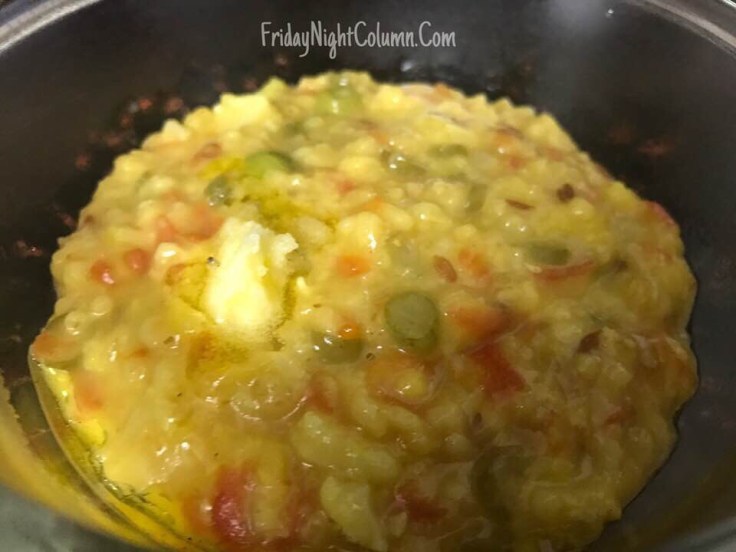 - Oats Khichri : Soak 1/4 cup yellow moong Dal in water for 15 minutes.Take 1 tbsp ghee in a small pressure cooker and put it on medium high heat. Add 1 tsp cumin seeds and let it splutter . Add 1tsp grated ginger and cook till it turns aromatic (~1 minute) . Add 1 cup of vegetables of choice (chopped carrots, French beans and peas ) , a pinch of turmeric powder and cook for a minute . Add 1/2 cup Oats (regular rolled oats like Baggrys ) , drained soaked moong Dal and 2 cups water to it . Stir and cook on high heat . Sprinkle salt to taste and pressure cook for 2 whistles.After 2 whistles, switch off the heat and Let pressure release on its own. Serve with a delicious dollop of ghee.