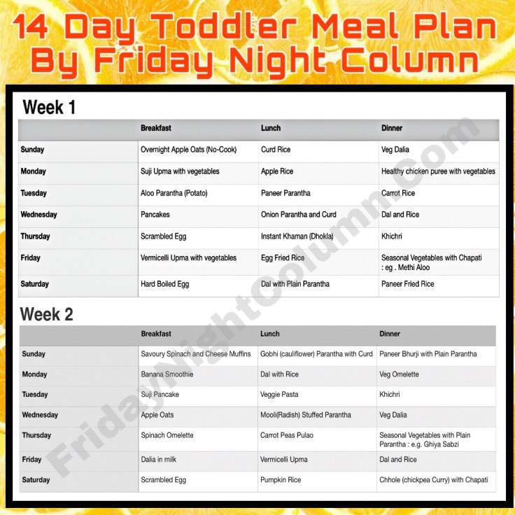 Refer to ‘ Recipe Index For Toddler Meal Plan by Friday Night Column ‘ for recipes mentioned in Meal Plan or reach us on Facebook / Instagram / Twitter.