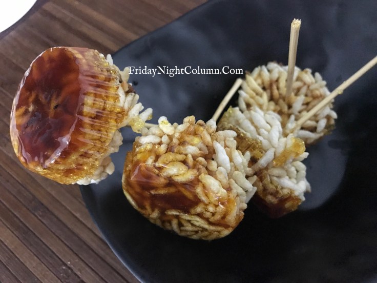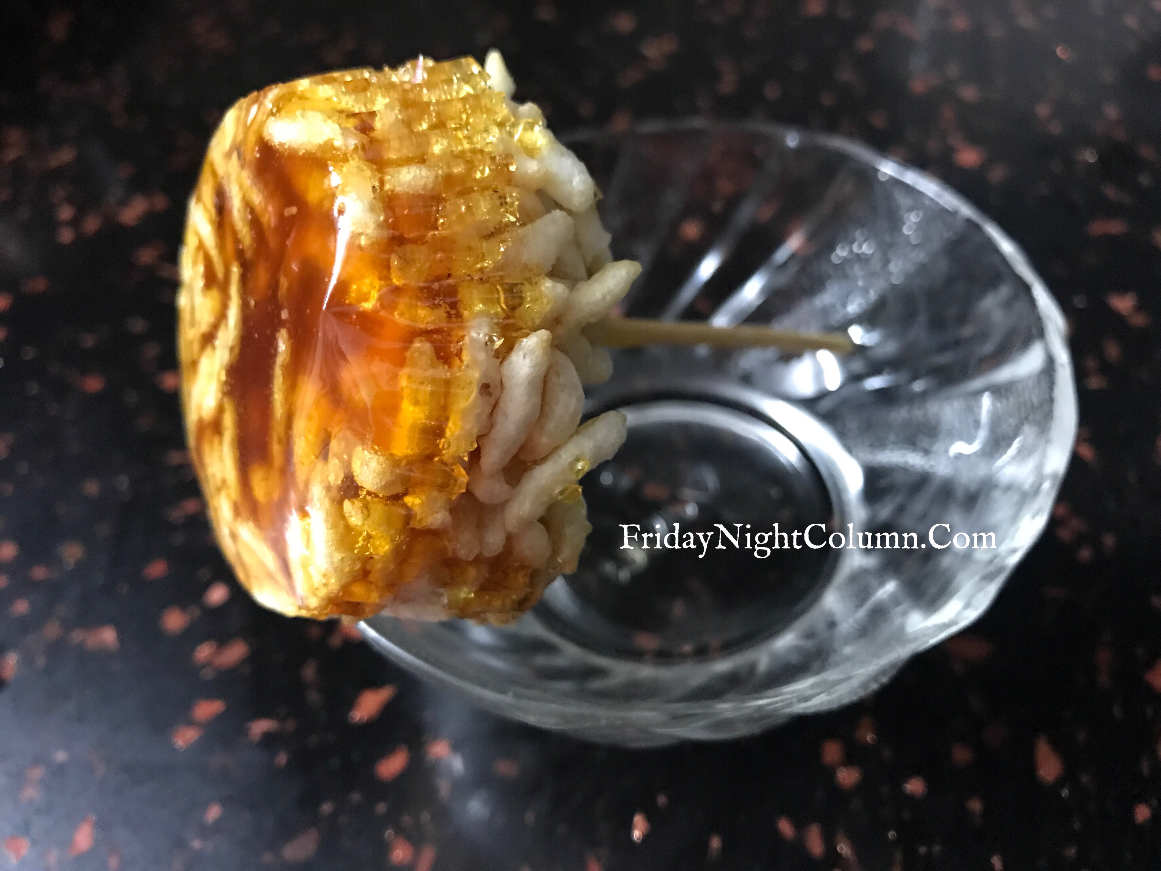 - Fix the skewers in perpendicular position while the caramel is hot. Also make sure you coat most of the Murmura with caramel while pouring.