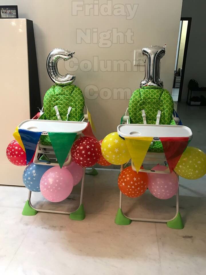 Before you plan the decorations , I highly recommend buying your high chairs (I have Chicco Pocket Lunch High Chairs) at this time . It’s perfect to inaugurate the high chair which you would be using almost daily from now on to feed solids .Decorate the high chair with alphabet balloons filled with helium , triangular colourful buntings , multicoloured balloons etc .